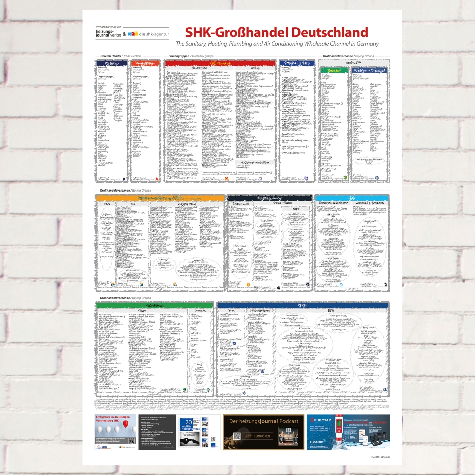Die Struktur des Fachgrosshandels SHK und aller Einkaufsverbände auf einen Blick an der Wand im Büro oder dem Besprechungsraum auf einem Poster – und zusätzlich immer dabei als praktische, gefaltete DIN A3 Karte. Sehen Sie auf einem Blick um Büro oder unterwegs, welches Unternehmen in welchem Verband organisiert ist: ISG, HBG, VMG, Sanitär-Union, GSH, E/D/E, HAGRO oder andere? Die perfekte „Landkarte“ des SHK-Großhandels, um auf einen Blick jeden Fachgroßhändler richtig einzuordnen. Sparen Sie im Kombipaket!